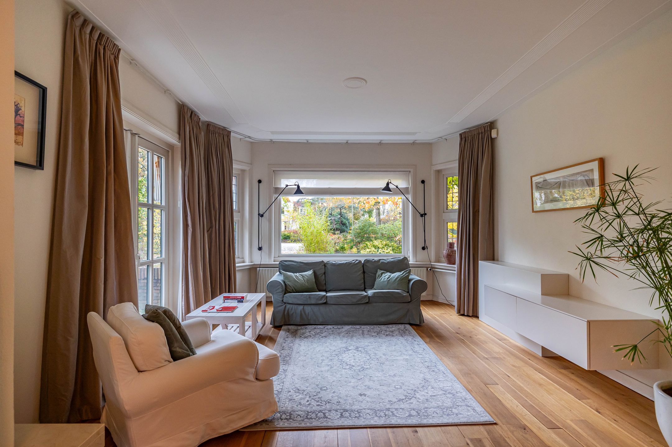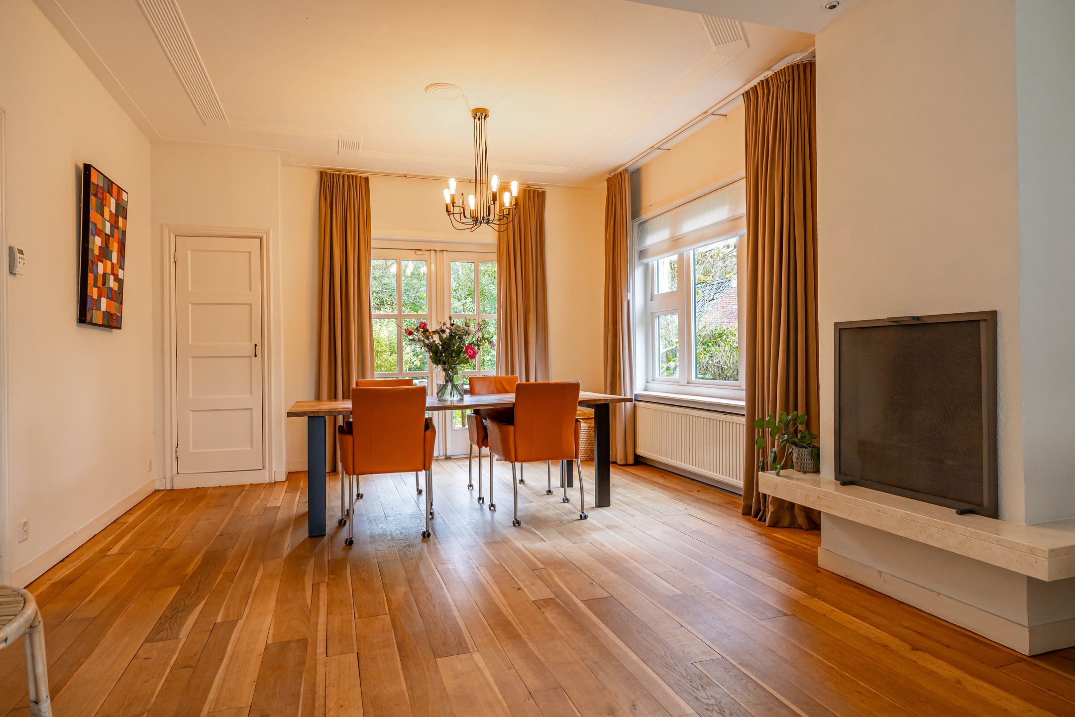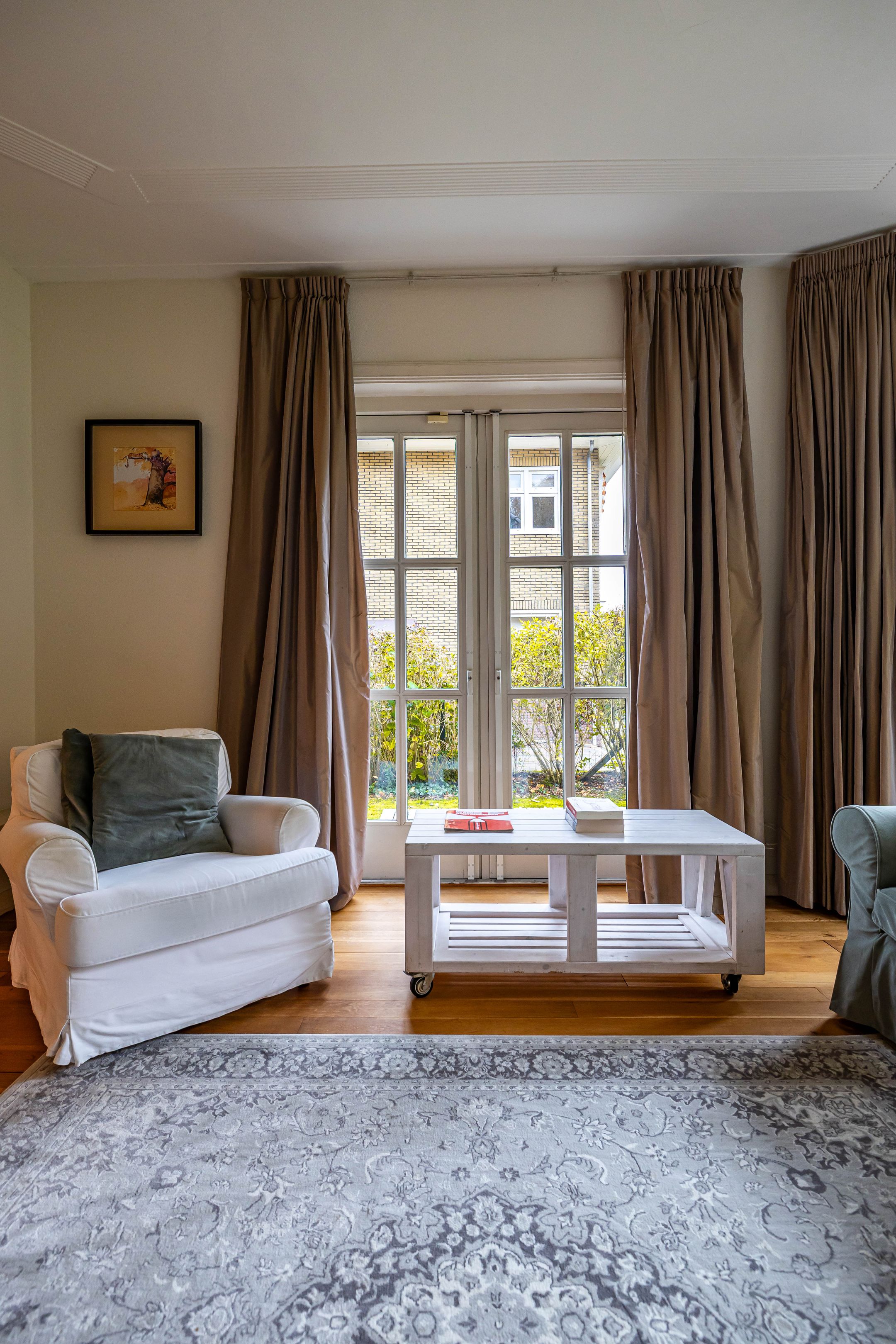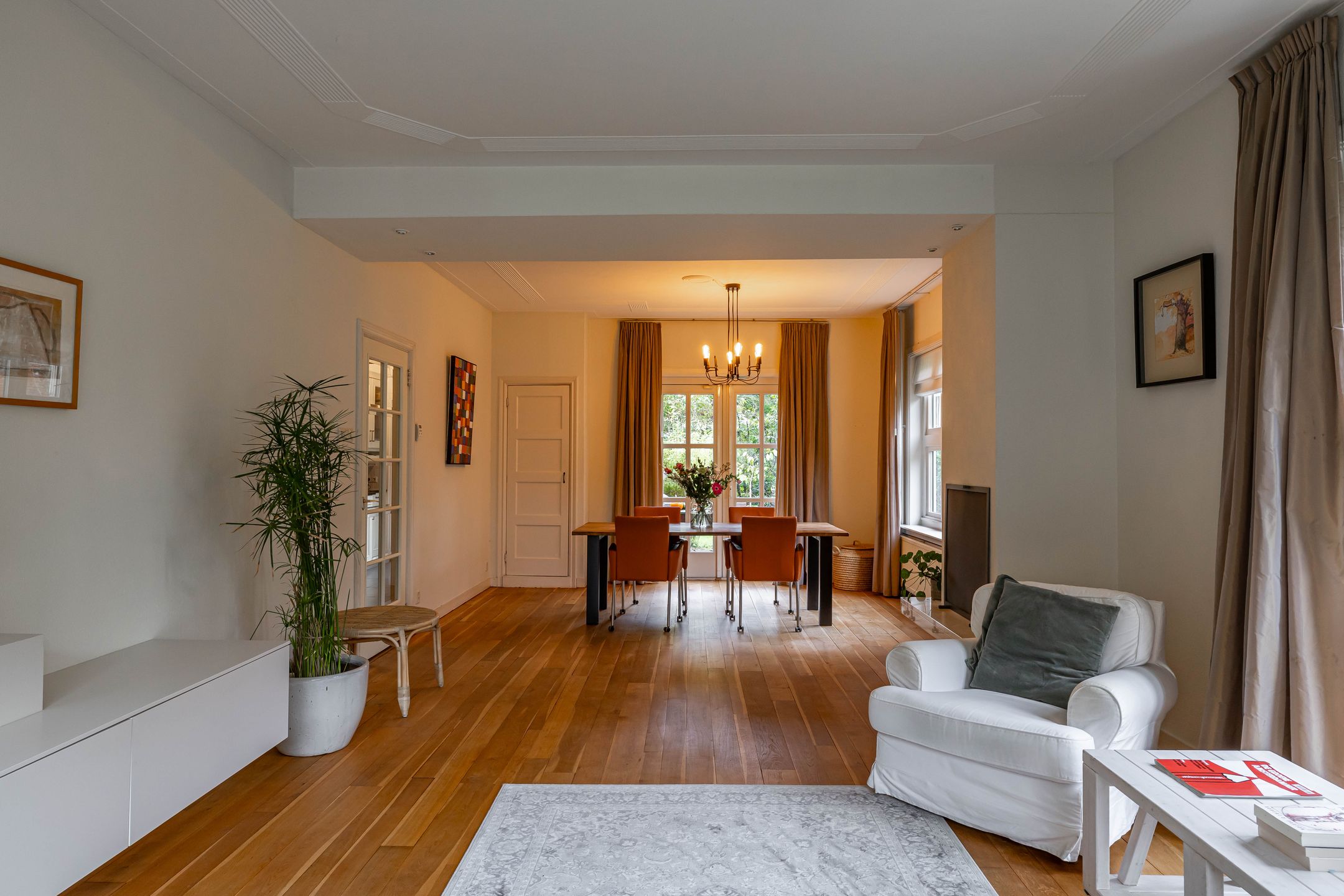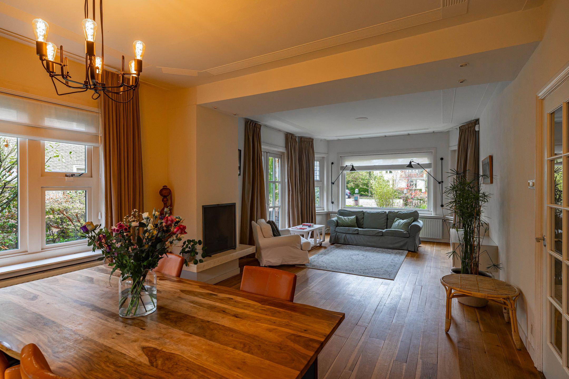 De woonkamer is ca. 39 m² groot met een prachtige parketvloer en open haard. Je kijkt door de vele raampartijen uit op de voor-, zij- en achtertuin, dus de verbinding met het groen is er altijd. Aan de zijkant én achterkant zijn er openslaande deuren om heerlijk de tuin in te stappen.