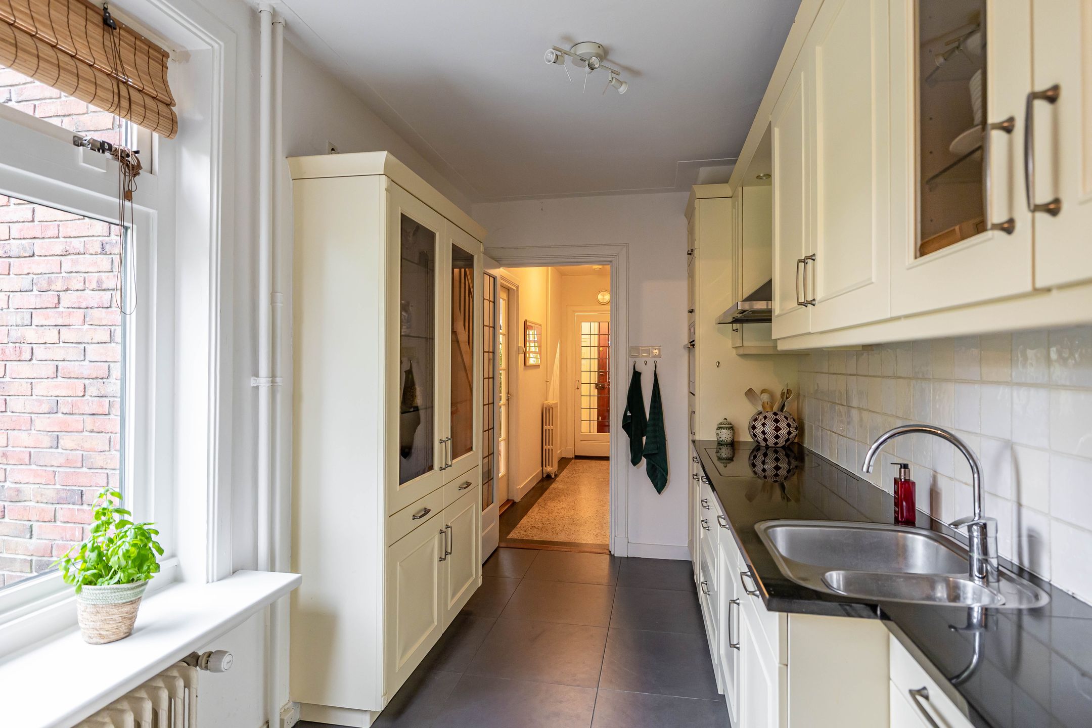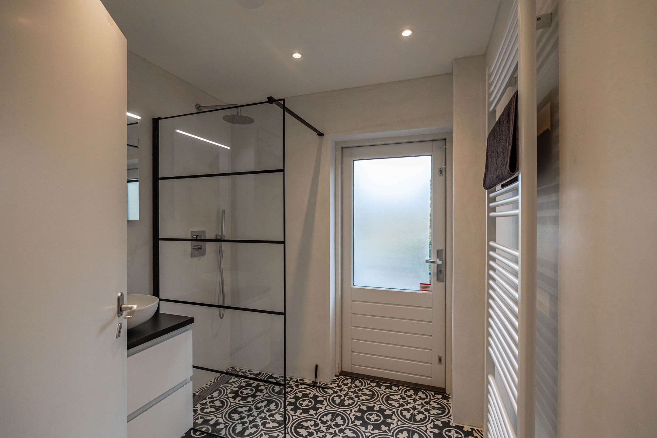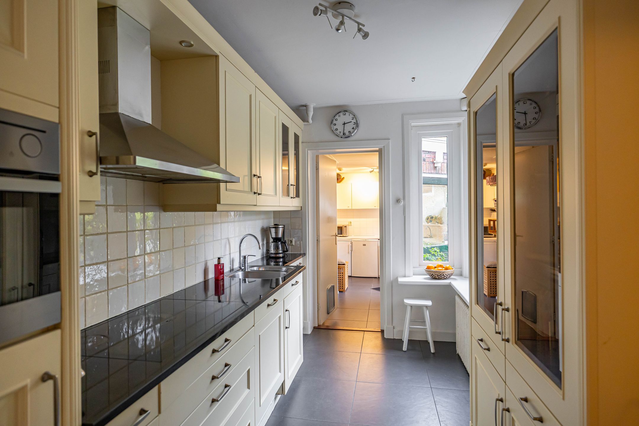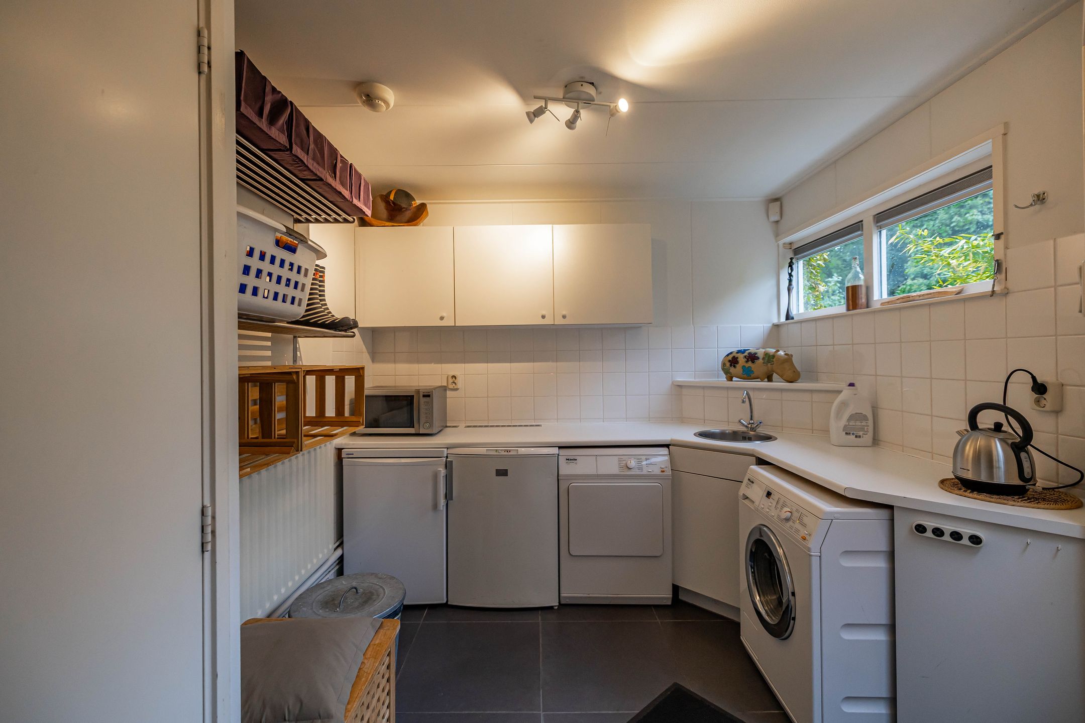 De keuken is uitgerust met een uitgebreide, functionele keukenopstelling in landelijke stijl, passend bij het karakter van het huis. De inbouwapparatuur bestaat uit een inductiekookplaat met afzuigkap, koelkast, oven en vaatwasser. De aangrenzende bijkeuken biedt ruimte voor witgoed en extra bergruimte.